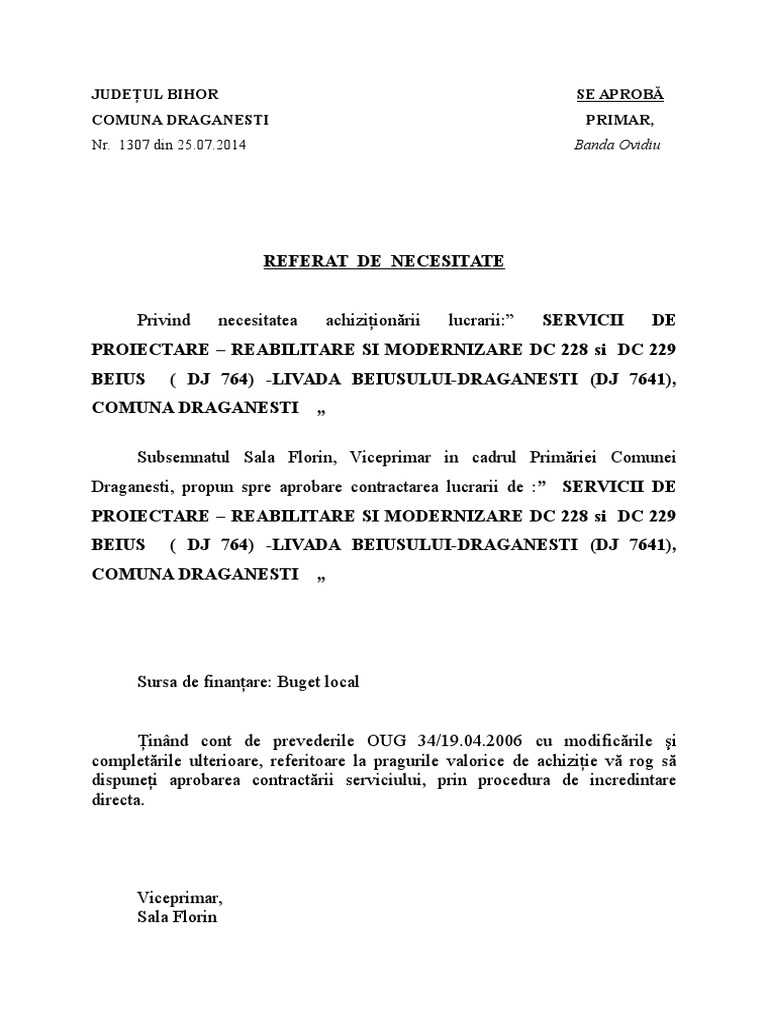 Referat De Necesitate Achizitii Publice Model 2018