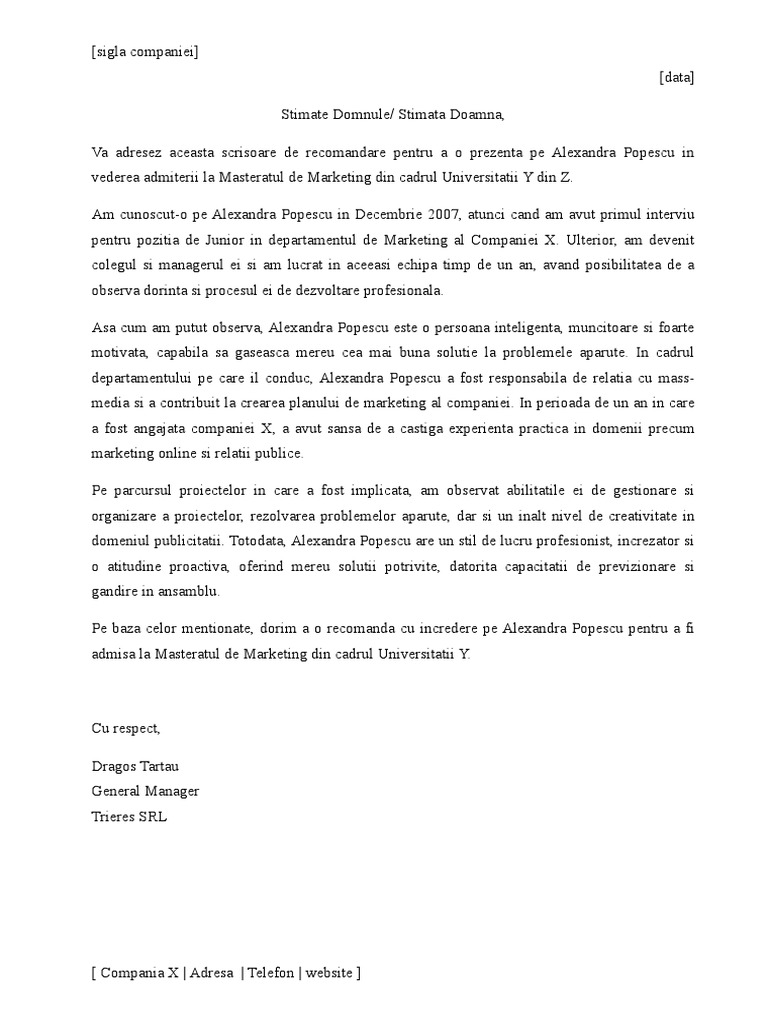 Model Scrisoare De Recomandare Pentru Masterat Din Partea Angajatorului