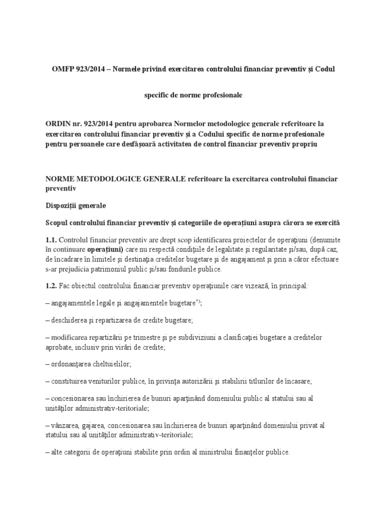 Omfp 923 2014 Normele Privind Exercitarea Controlului Financiar Preventiv Si Codul