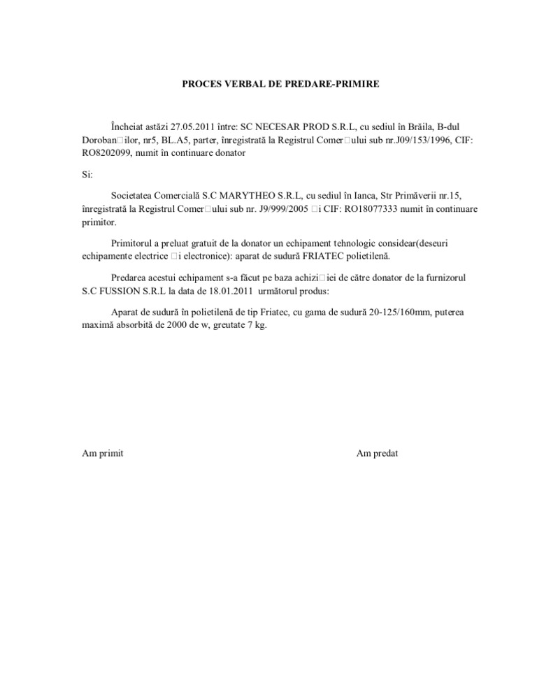 Proces Verbal De Predare Primire Echipamente Pdf Document